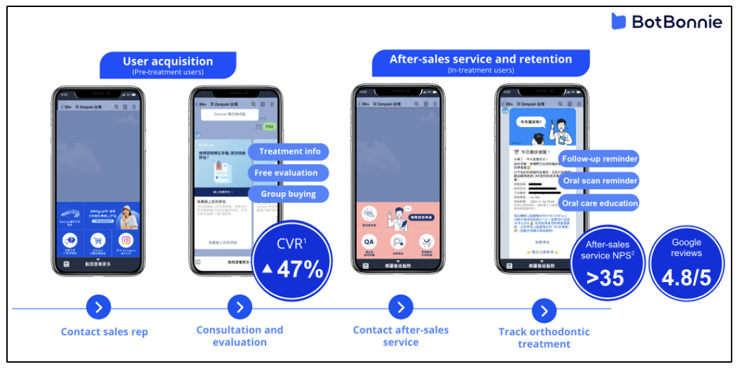In the Taiwan market, Zenyum employed BotBonnie to facilitate OMO personalized engagement. Zenyum utilized the LINE Official Account to attract pre-treatment users to register, achieving a 47% CVR through incentives like group buying and free evaluation.