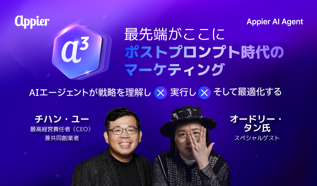 最先端のAI技術で企業価値の創造を支援するAIネイティブソフトウェアカンパニーのAppier Group 株式会社 (エイピアグループ、本社 : 東京都港区、代表取締役CEO : チハン・ユー、証券コード : 4180、以下 Appier ) は、「エージェント型AI」のマーケティングソリューションへの実装に向け、2025年10月17日(金)、東京港区内にてイベントを開催しました。台湾初のデジタル担当大臣を務めたオードリー・タン氏との特別対談や、Appierの最新AIエージェントを活用した企業の事例発表、またマーケティング活動をフルファネルで網羅する、8つの専門AIエージェントの実演なども行い、300名ほどのAIマーケティング・スペシャリストや広告業界の関係者が集い、今後の最重要トレンドとなる、エージェント型AIを活用した、新次元マーケティングの戦略について活発な議論が交わされました。
