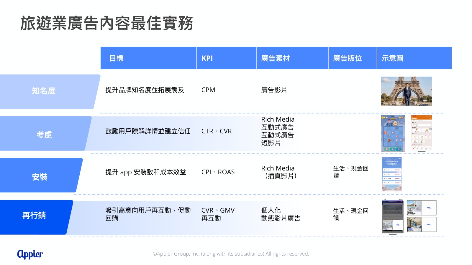 本月第二個亮點則分享旅遊產業廣告的成功關鍵在於「分段式創意策略」與「個人化內容」的結合。報告指出,於建立品牌認知階段時可利用 AI 動態影片 極大化增加觸及;接著再透過 互動式廣告(如翻頁、刮圖) 讓用戶動動手指,增加對品牌的好感與信任。最終轉化的核心則在於 AI 個人化商品推薦,透過數據精準推播用戶感興趣的景點或飯店,實測顯示能提升轉化率達 71%。這套策略成功結合了感官體驗與數據科技,將旅客的興趣轉化為實質業績。