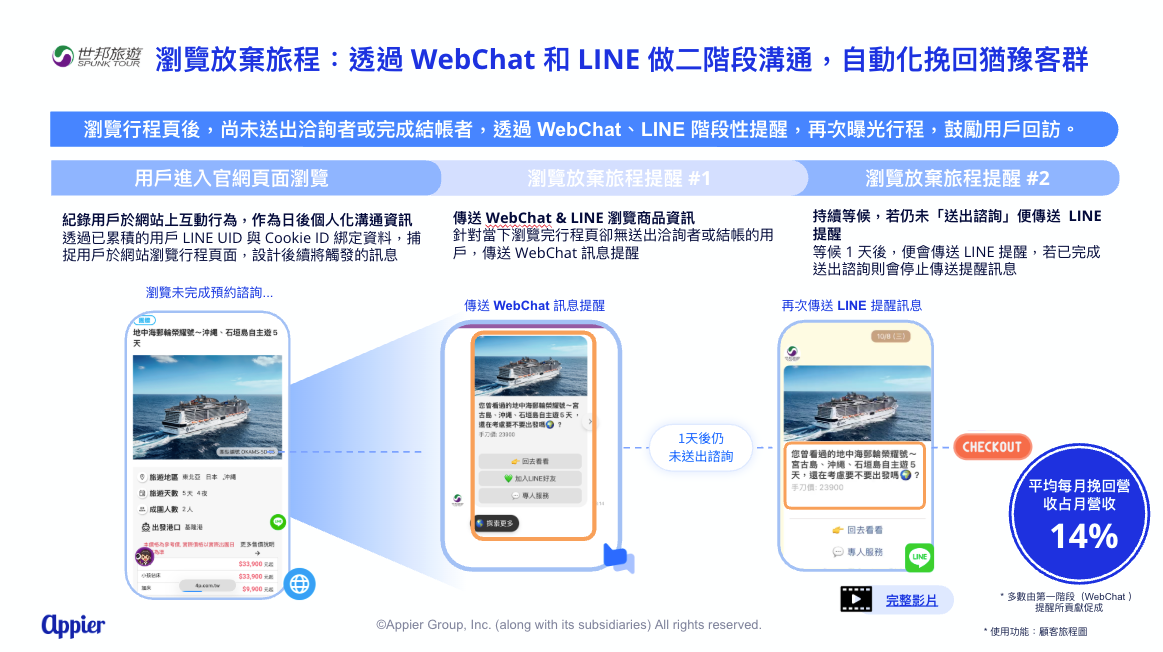 系統會接續透過 WebChat 與 LINE 進行兩階段性的提醒,再次曝光旅客先前感興趣的行程,鼓勵用戶回訪。此自動化旅程成功挽救大量潛在訂單,其所促進的轉換營收,佔每月全站總營收約 14%,顯著提升了業績貢獻,並確保潛在顧客不被遺漏。