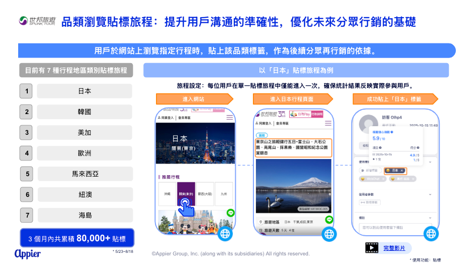 為實現精準溝通,世邦旅遊利用 Appier 建立品類瀏覽貼標旅程。當用戶瀏覽指定行程時,貼上該行程地區類別標籤(如日本、韓國等)。此舉有效建立了消費偏好分眾資料庫,於三個月內累積超過 80,000 次貼標,為後續的活動推薦、新行程上市提供精準依據。這些標籤不僅提升了行銷活動的相關性,也為深化顧客關係管理奠定了數據基礎,讓每一次溝通都更貼近顧客的真實需求。