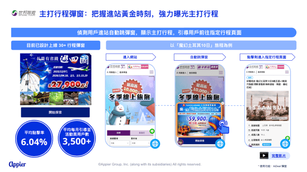 為最大化關鍵行程的能見度,世邦旅遊導入 AiDeal 執行主打行程彈窗。此機制鎖定「所有進站訪客」,只要用戶一進入官網,系統便會自動跳出彈窗,展示當季主打行程,並引導用戶前往指定活動頁面。共設計並上線 30+ 種不同的行程彈窗內容,創造了平均 6.04% 的高點擊率。此舉成功為重點行程帶來精準流量,平均每月引導超過 3,500+ 用戶至指定活動頁,大幅提升了主打行程的曝光與導流成效。