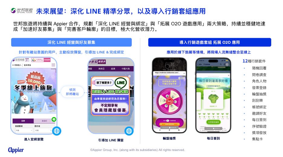 展望未來,世邦旅遊將持續深化與 Appier 的合作,並聚焦於三大策略:首先是深化 LINE 經營,針對有離站意圖的用戶,主動投放彈窗,引導加 LINE &完成綁定,加速好友募集。其次,將預計將拓展 O2O 應用,導入「行銷遊戲套組」,應用於線下旅展等情境,將現場人流無縫整合至線上。